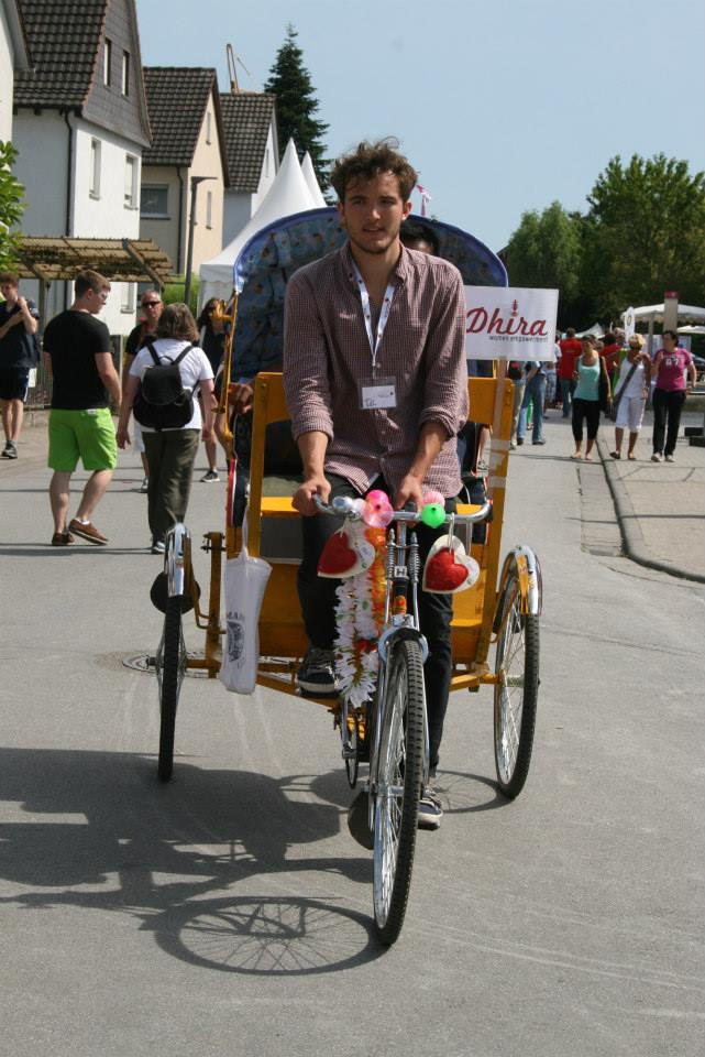 (links) Jonathan, Mitglied von Dhira auf der Rikscha